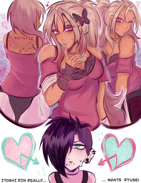 | RYURIN, cool mooties, zzz, bllk, animanga, my comfort characters (rin + shidou + kokomi), writing + art, wlw ships, femlock!!, and obv the loml, eku <3 |